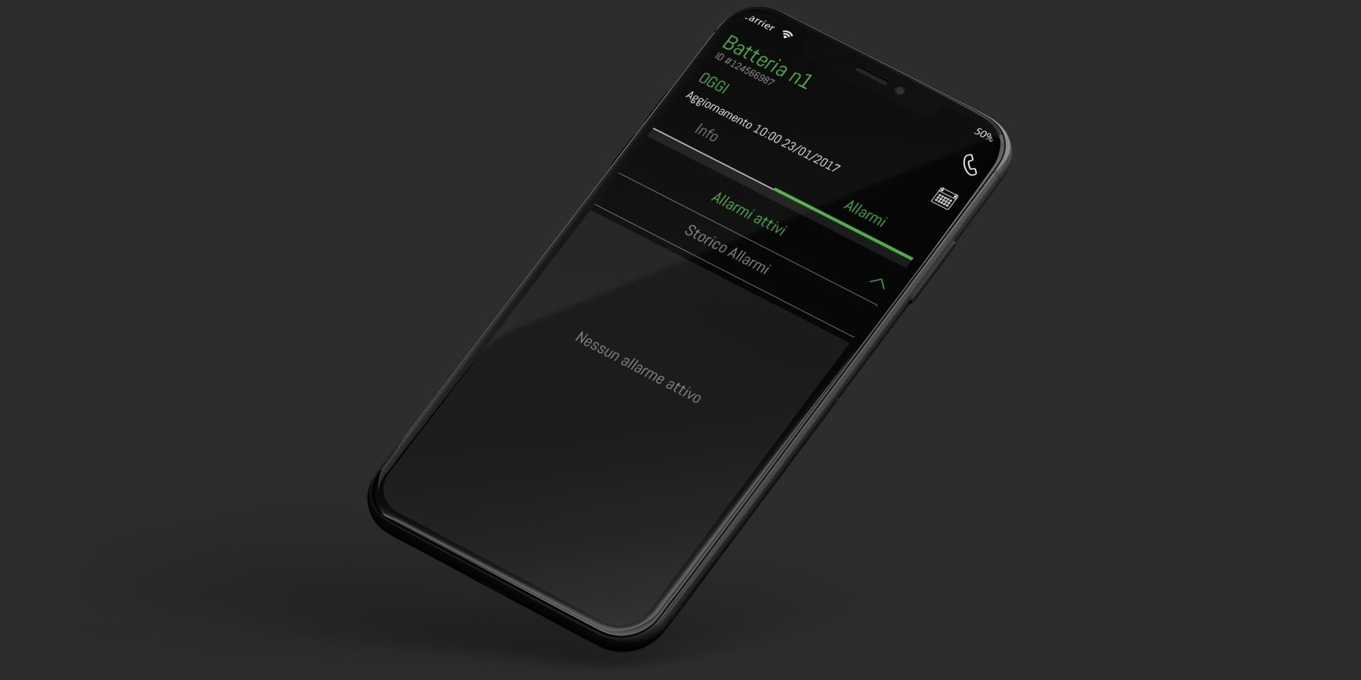 Inoltre, l'applicazione offre la visualizzazione dello storico degli allarmi, rappresentati con diversi colori a seconda della loro gravità. Questa funzionalità permette al cliente di analizzare gli eventi passati e di identificare eventuali pattern o trend che possono influenzare le prestazioni delle batterie nel tempo.