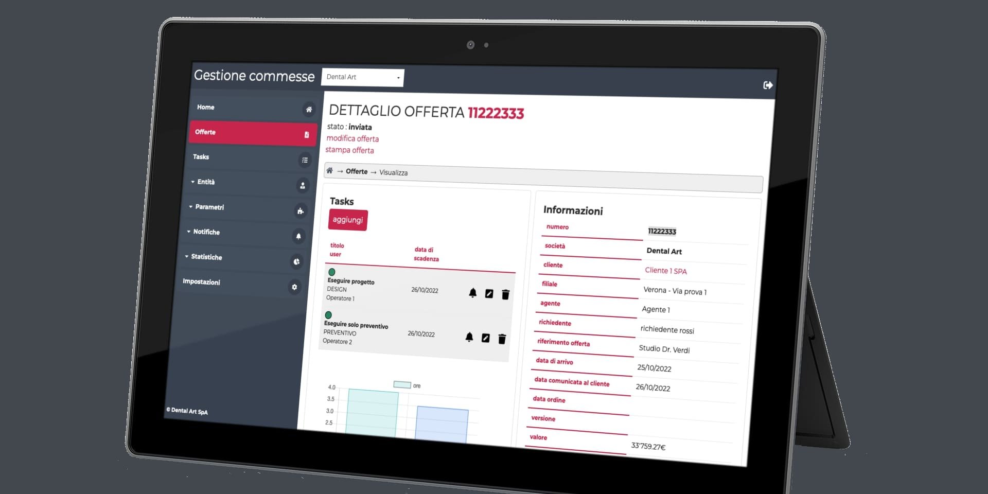 Infine, il portale web consente agli agenti e ai clienti di accedere in modo sicuro e limitato ai dati rilevanti ai loro progetti, consentendo loro di recuperare informazioni cruciali in tempo reale. Questa accessibilità migliorata contribuisce a una maggiore trasparenza e comunicazione tra Dental Art, i suoi collaboratori e i clienti.